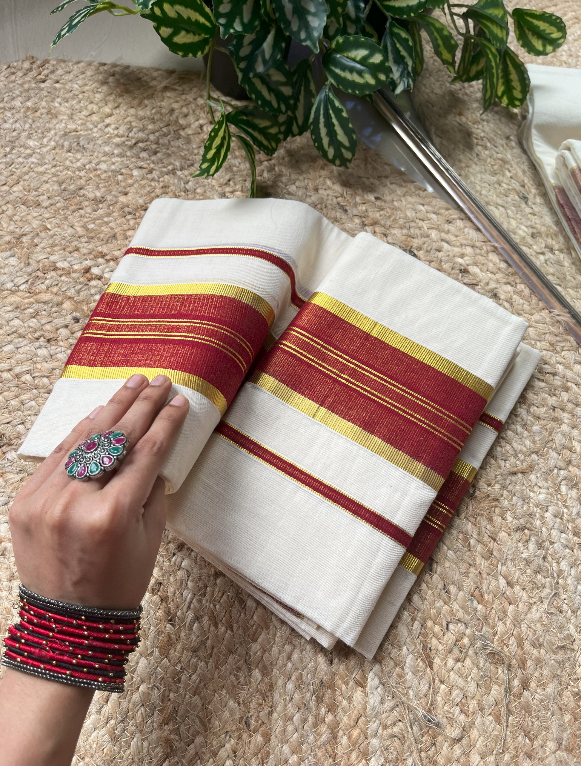 Kuthampully handloom cotton set mundu (mundum neriyathum) with maroon & golden border. Pure cotton Kerala traditional wear- TR 032