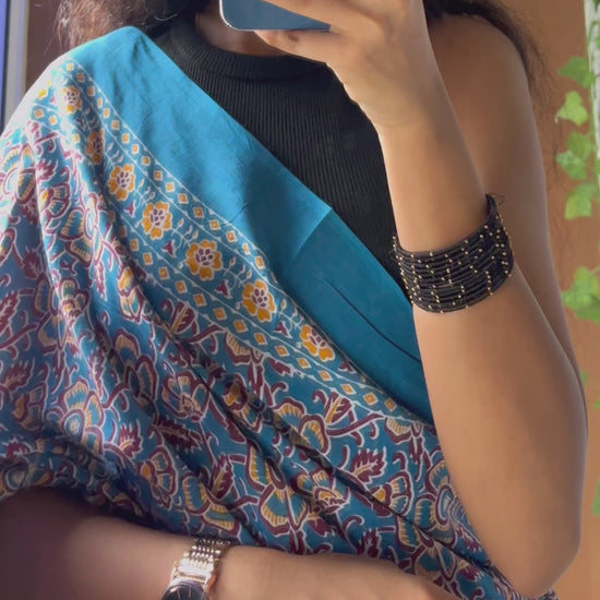 Celebrate tradition with a modern edge in this beautifully handblock printed saree. Crafted from 100% pure cotton, this blue ethnic saree features intricate handblock motifs in rich multicolor detailing — perfect for warm-weather comfort and cultural flair.