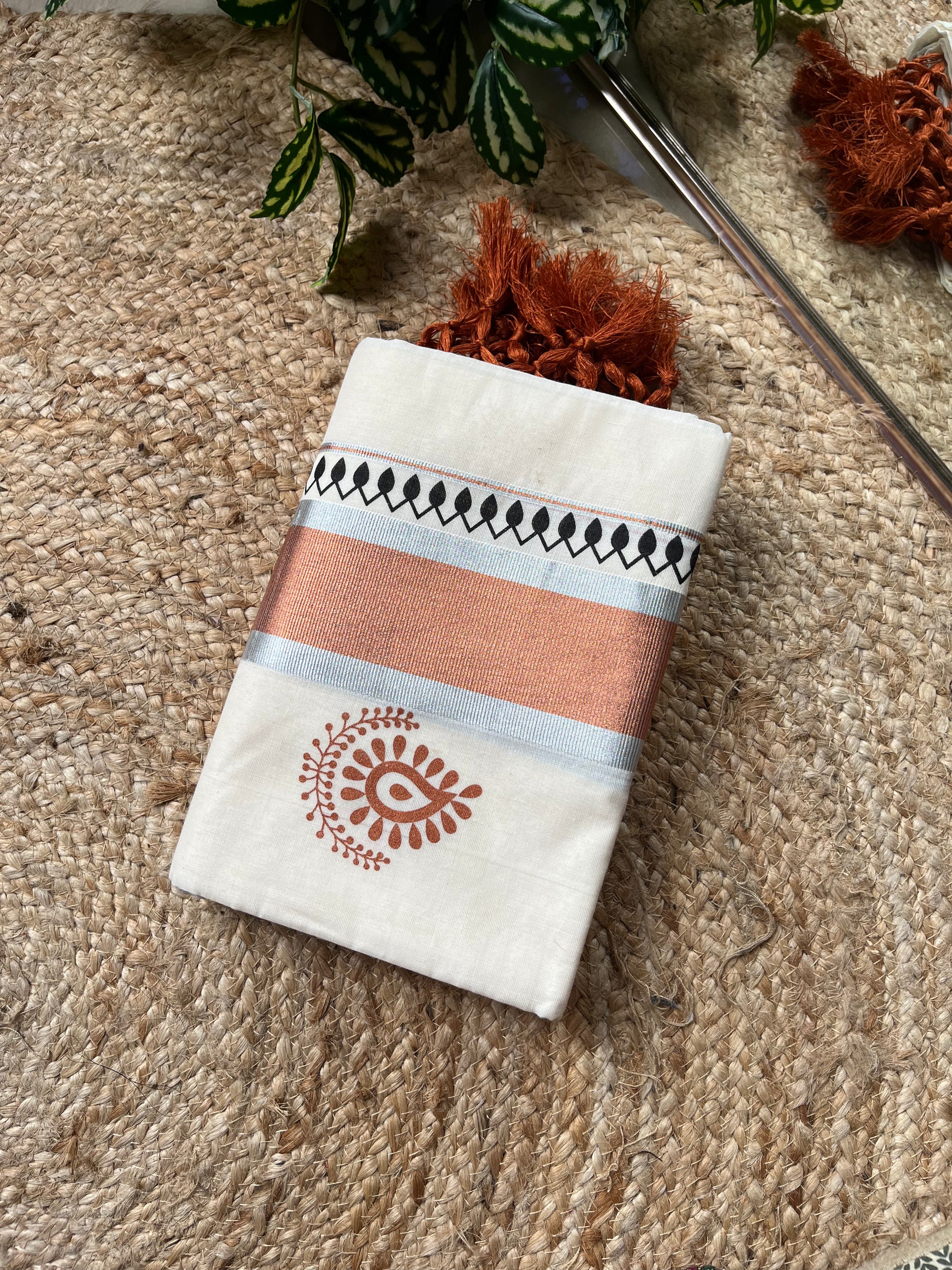 Design: Off-white with copper kasavu border, paisley motifs & tassels