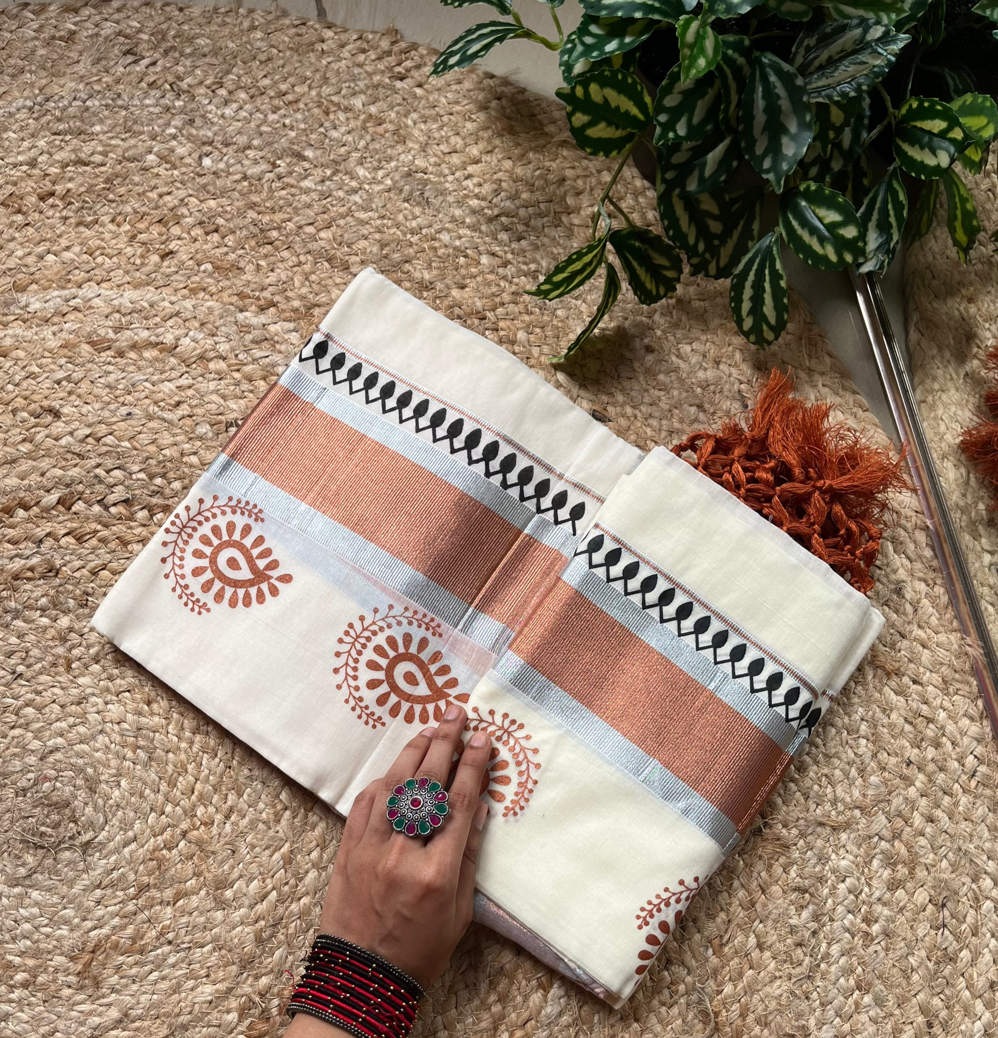 Kuthampully handloom cotton set mundu with tassels, copper kasavu border & motifs. Pure cotton Kerala traditional wear for festivals - TR 033